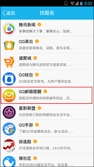 在列表中查找并点击“QQ邮箱提醒”服务卡片。