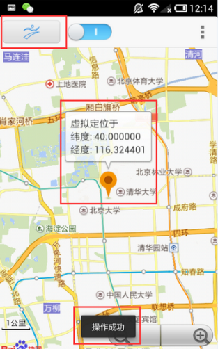 点击左上角神行者logo,界面上方弹出气泡式坐标信息,下方同步提示“操作成功”,表示虚拟定位已就绪。