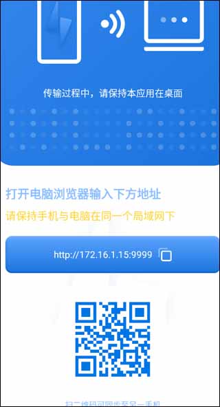 打开应用后进入首页,点击“开始发送”,系统会自动生成专属二维码和访问地址。若向另一台手机传文件,对方用本机相机扫描即可加入传输通道;若要发到电脑,只需在浏览器中输入屏幕上显示的局域网地址,网页端立即加载上传界面。