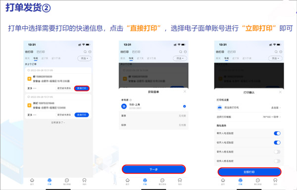 发起寄件时,选择已有收件人或新建信息,确认无误后保存订单;进入打印环节,勾选目标运单,选择已绑定的面单账号,点击“立即打印”即可完成出单。