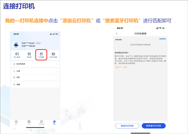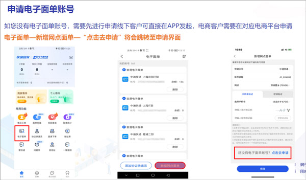 首次使用需申请电子面单权限,线下客户可直接在App内发起申请;电商用户则需先在所属电商平台完成面单开通,再返回本App绑定账号信息。