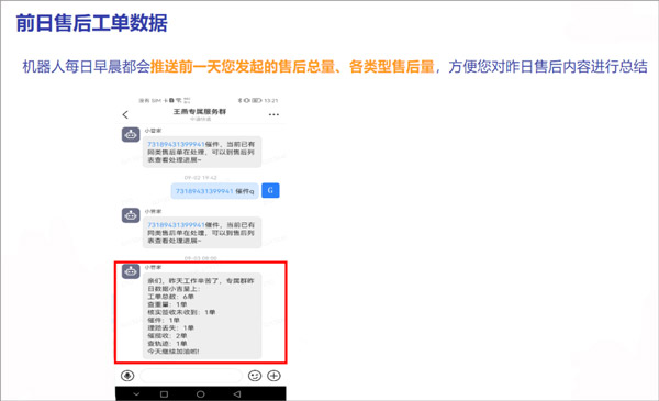 每日早间机器人会推送前一日售后数据概览,包括总量、类型分布与高频问题,便于商家复盘优化服务流程。