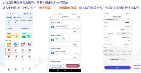 电商用户同样可以绑定电子面单,路径为首页→电子面单→新增网点面单,输入账号与短信验证码后保存生效。
