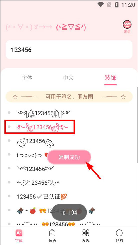 在首页完成基础字体尝试后,点击右下角“我的”入口,进入个人功能中心。此处集中管理个性化服务模块,包括快捷键盘启用开关、常用短语收藏夹、自定义模板保存区等。找到“特殊文字键盘”选项,开启后按提示完成系统输入法权限授权,即可在任意输入场景长按空格键唤出专属符号面板。