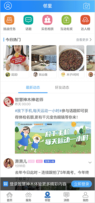 邻里模块呈现熟人社会的数字延伸,朋友晒出的菜市场见闻、孩子手工课作品、小区新装的健身器材,你都能即时互动;