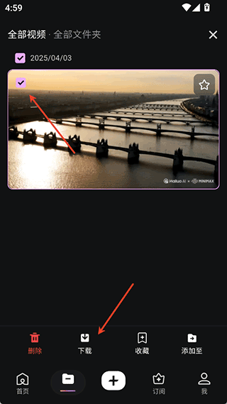 所有完成渲染的视频统一归集在“我的作品”列表中,每条记录右侧设有复选标记,勾选后底部操作栏即刻浮现下载选项。