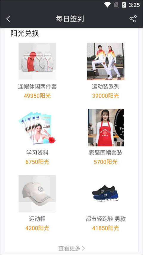 阳光不仅可用于补签,还能在商城中兑换实物商品,包括知名运动品牌服饰等实用物品