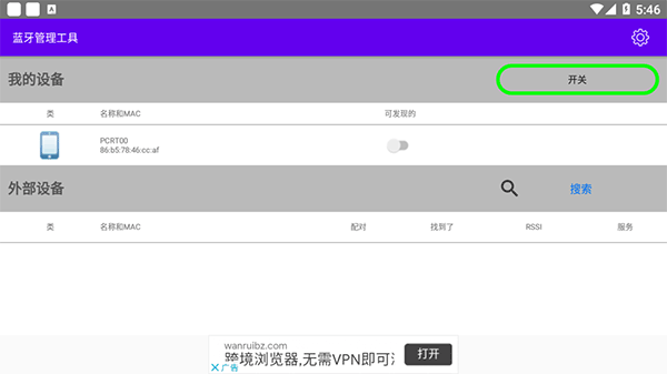 打开BluetoothManagementtool软件,点击开关即可自动搜索附近的蓝牙设备。
