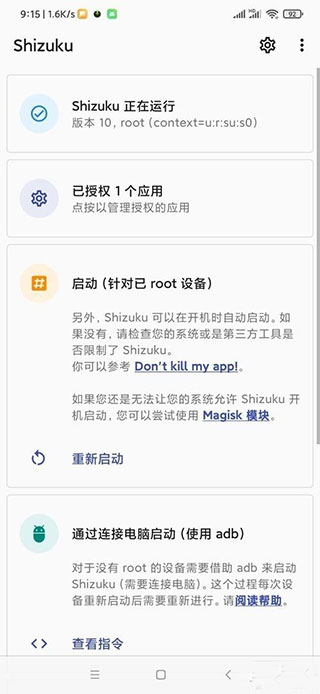 若选择 Shizuku 模式,需先安装 Shizuku 应用,并在授权列表中确认已有应用获得相应权限。