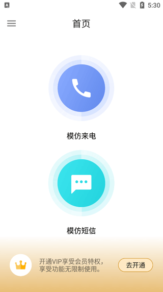 打开模仿来电应用,主界面提供“模仿来电”与“模仿短信”两个选项,点击进入模仿来电功能模块。