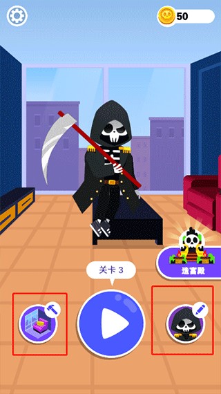成功触发死亡事件后获得金币,回到主界面,左右两侧即为装扮与陈设商店,更换死神造型或布置专属冥界小屋。