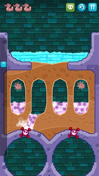待红色开关与两只鸭子均已触发,先清理下方两条平行通道正上方的泥土,再迅速打通红色卡口,借势将水流导入右侧通道。