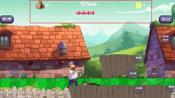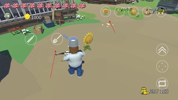 启动游戏后点击“开始游戏”,即可进入随机生成的地图场景。左上角跳动的大脑图标代表戴夫当前生命值,屏幕底部实时显示已击杀僵尸数与累积阳光量。右侧区域集成视角旋转、跳跃、瞄准、换弹等操作按钮,响应迅速,适配移动端直觉操作。