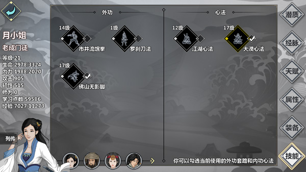 每位侠客均可修习多种外功与心法,上限为各三种。初始所学的外功与心法不可移除,其余武学则可通过无名剑进行替换,返还全部残章及半数学习点数。李佩芷凭借灵心慧质天赋,可额外多学一门外功与一门心法;主角依托专属模板,不仅可多修两门外功与两门心法,还能移除初始武学,自由重塑战斗风格。