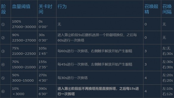 全视之魔眼拥有30000点固定血量,无护甲,无魔法抗性,但其机制核心在于阶段转换——既取决于剩余血量,也受关卡时间严格约束。战斗开始后计时启动,即便全程未对其造成任何伤害,390秒一到,Boss自动迈入第六阶段,开始按既定顺序摧毁防御塔。值得注意的是,靠近主城入口及承担主要输出任务的塔位,会被留到最后拆除。