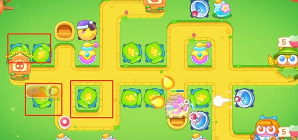 地图中央区域可增设炮台专注清理道具,新塔暂不升级,视战况灵活调整。