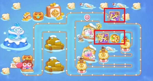第五波在左侧新增船锚与鱼雷炮,击破左上方宝箱后获取塔防火瓶。