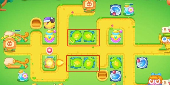 第一波将左侧粉红瓶升至满级,右下角放置地雷,再建一座瓶子塔,左上方配一座月亮塔。