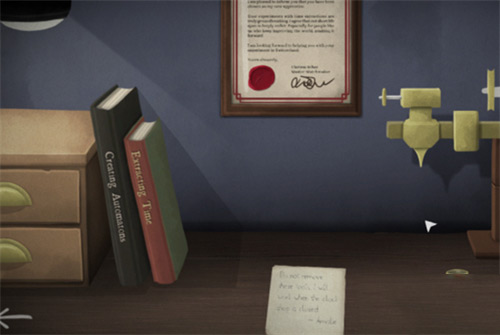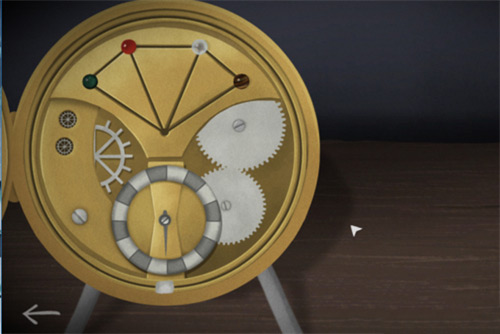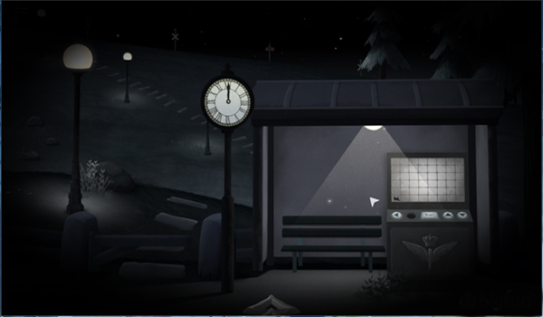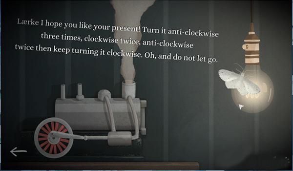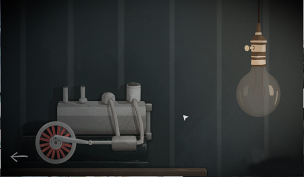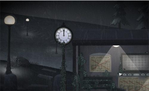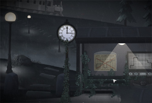 关键要素为钟表与火车路线图。观察发现控制火车的机器缺少一个“→”按钮,需先寻回。不过解谜顺序较为自由,可按场景从左至右依次探索。