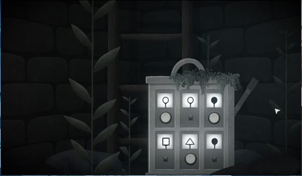 正确配置为:左上角黑色三角、右上角空心三角、中下空心方块。完成后向下拉动右侧控制杆,再向左横拉谜题板,取出内部物品。