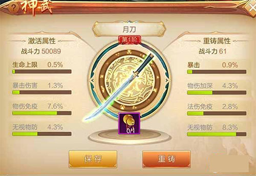 每次神武升级可获得一点“祝福点”,积满后提升等阶。共设四阶,依次解锁生命上限、法术防御、暴击伤害与法伤免疫。每阶神兵均配有独特外观,可自由幻化。若对当前属性不满,还可通过重铸随机刷新数值,直至满意再行锁定。