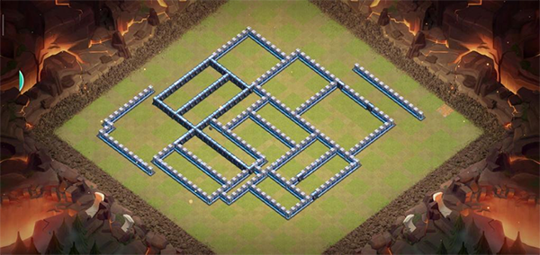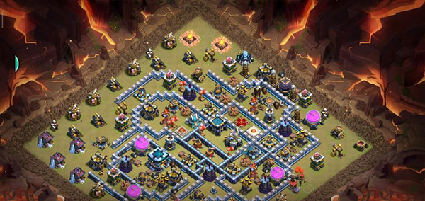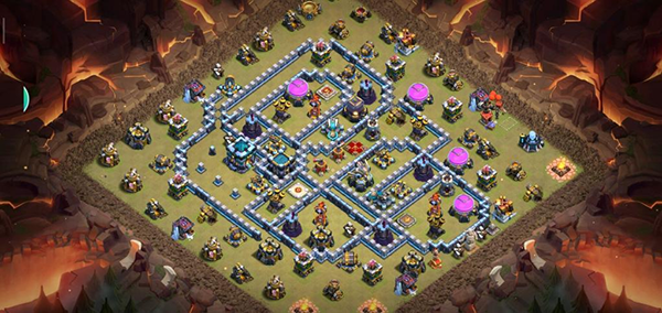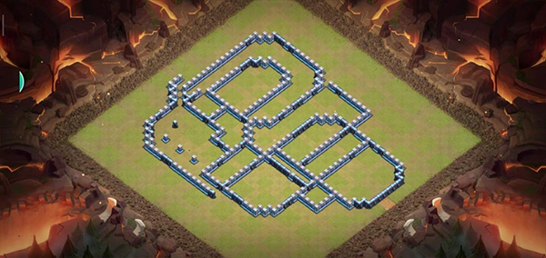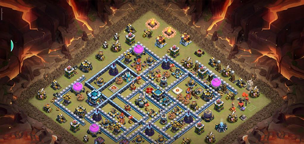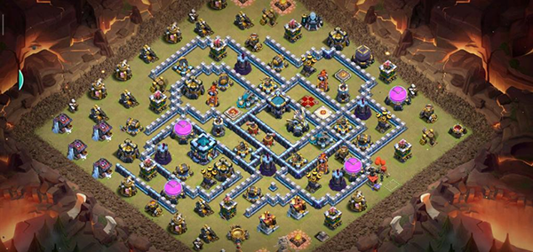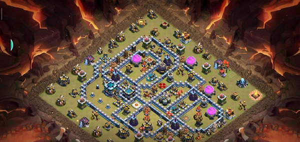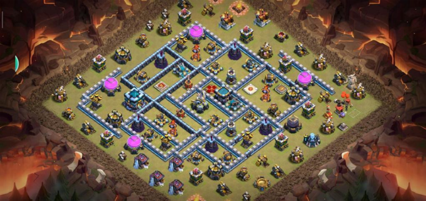 阵型解析:此为大本偏置的14本不规则菱形格子阵,大本与核心区域分离。该布局常见于高阶防守,陆军需依赖弹跳或地震法术才能穿透。火塔分散布置,五座电塔巧妙埋设,既能防止清边又能诱导敌军走偏,实战表现优异,适合常规部落战环境。