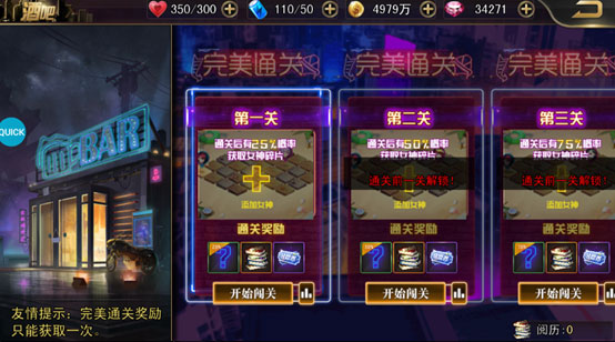 三档关卡碎片获取概率逐级提升:首关25%、次关50%、终关75%;各关卡均设有独立排行榜。