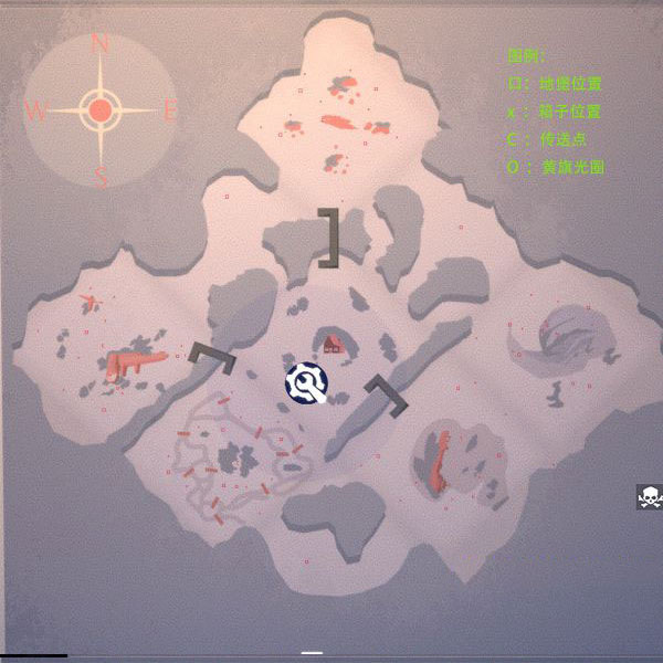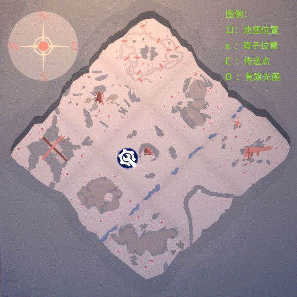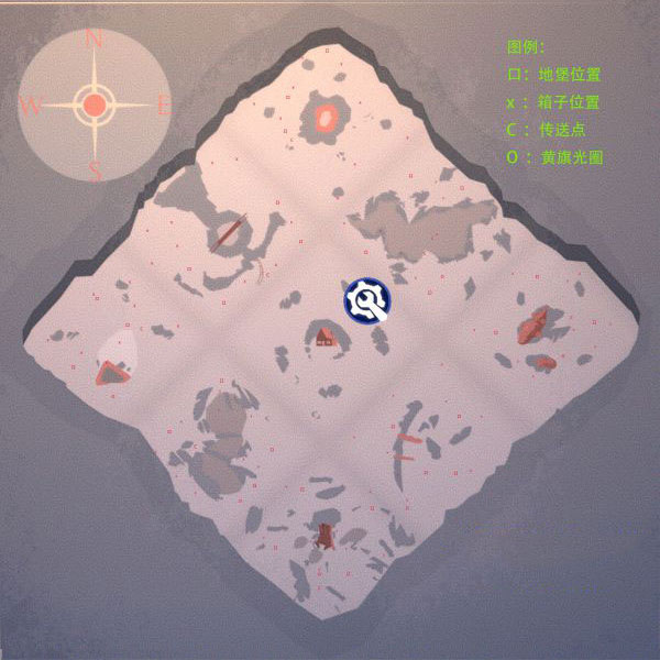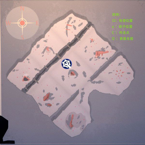 此图为六张地图中最贫瘠的一张,周边仅五处有地形,西北、东北及南部各仅一个地堡,且无额外箱子。西北与东北炸桥点附近分别有三只白狼与黑狼,稍有不慎便可能丧命。建议暂避北部冰川脊,优先从西部诺曼底峡谷或东部目击者区域开始,清理下方四点后再前往北区。整图血量上限通常不超过3000,路径迂回复杂,对幸存者挑战较大,但也因此形成某种平衡。