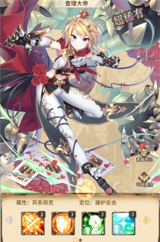 查理曼,风系坦克,提供援护与反击机制。技能配置为两主动两被动,100级全开。