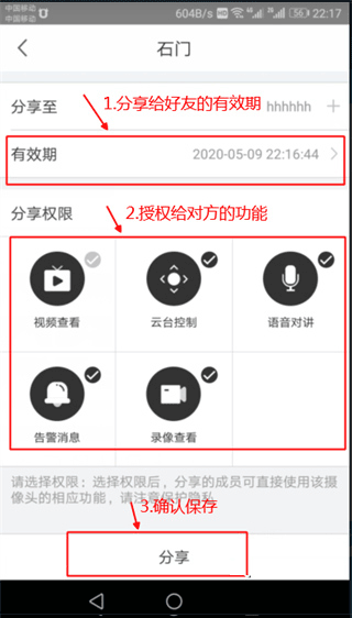 设置分享时限,勾选授权给对方的功能权限(如仅限视频查看或更多操作),确认无误后保存设置
