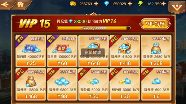 之后直接购买钻石,可以看到充值成功,已经购买好了;