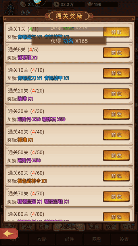 完成关卡挑战后,系统将自动发放对应奖励,包括武将碎片、资源包及稀有道具。