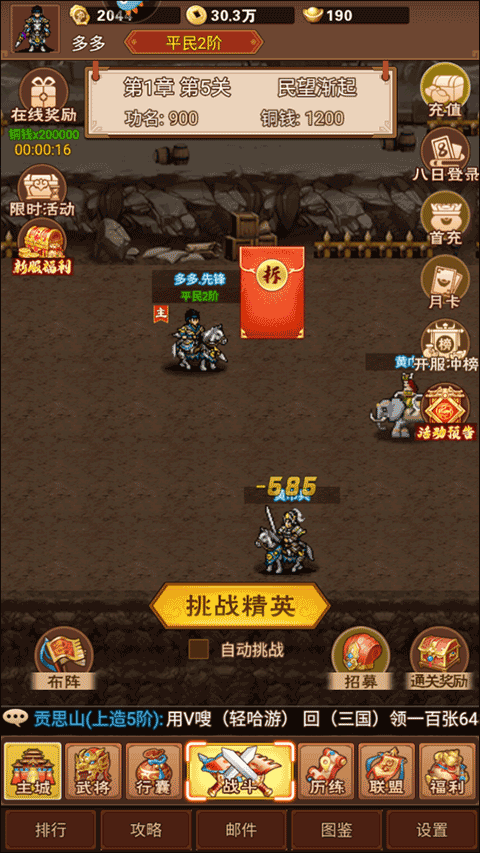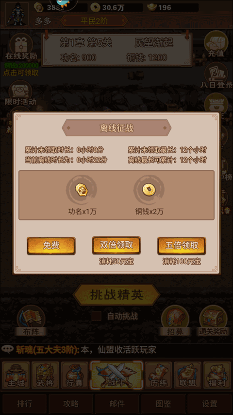 每日参与猛将挑战、南蛮入侵、清剿黄巾、争霸天下及刷宝箱等五大核心活动,不仅能获取武将经验、功勋与稀有材料,还能稳定积累木材、粮食、铁矿与铜币四大基础资源。