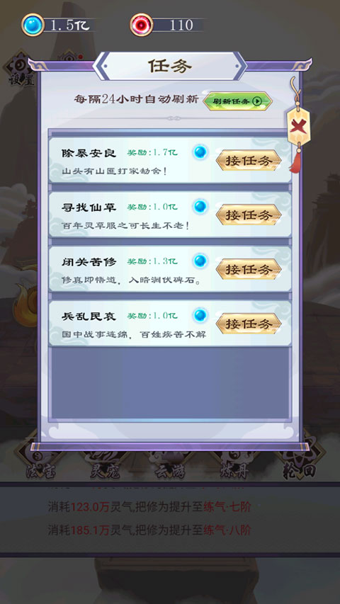 每日刷新的修行任务提供丰厚奖励,助你稳步前行;