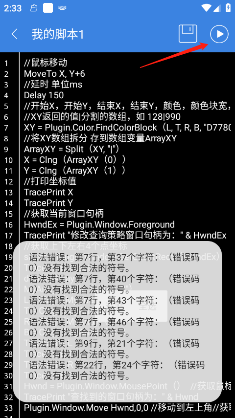 在代码编辑完成后,点击右上角的“运行”按钮执行脚本。