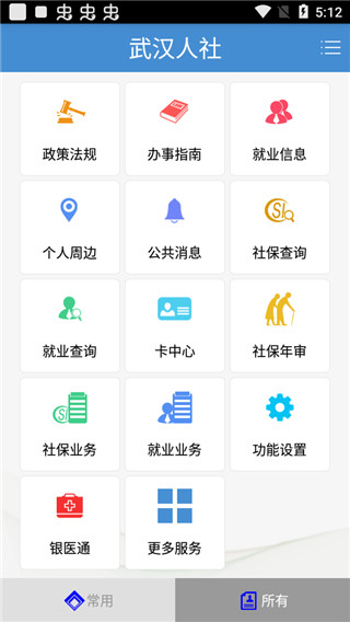 点击“所有”选项,即可浏览武汉人社app提供的全部功能列表,方便快速定位所需服务。