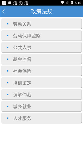 在政策法规栏目中,可根据实际需求浏览劳动关系、社会保险、城乡就业、人才服务等相关内容。