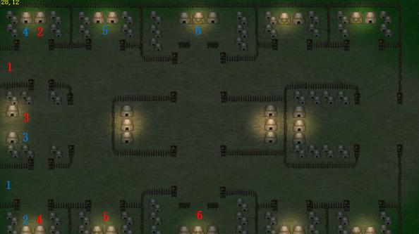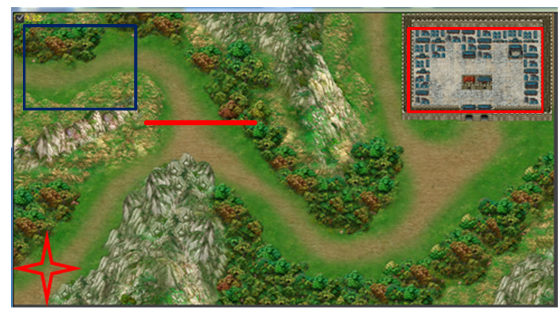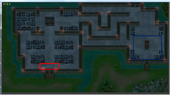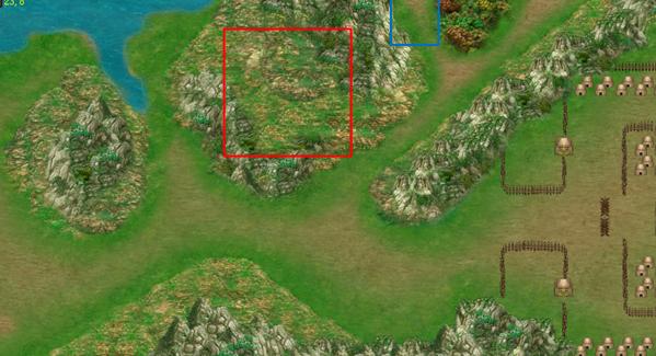 第二回合双方主力部队入场,进入清兵阶段。当营寨内敌军少于四十人时,蓝框处将涌出九名伏兵。