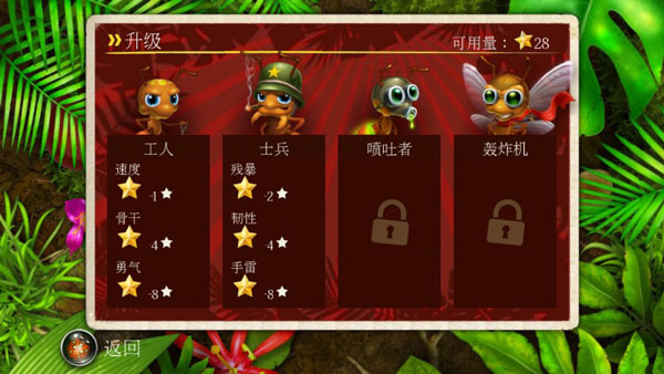 游戏提供工人、士兵、喷吐者和雄蚁四种蚂蚁类型,通关关卡获得的星星可用于提升各项能力,增强整体防御与作战效率。