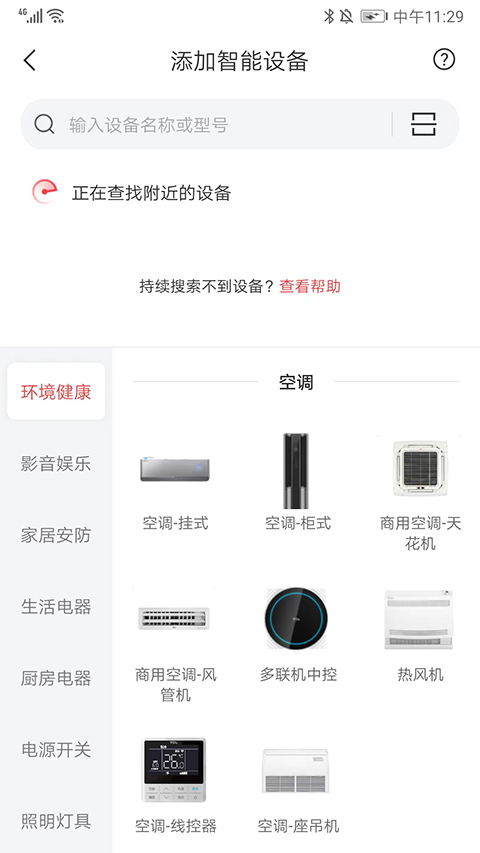 在设备页面,用户可添加并管理智能家电,支持通过输入设备名称、型号或扫描二维码完成配网。