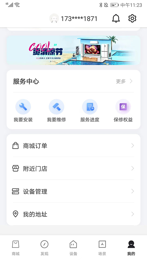 我的页面整合了安装记录、服务进度、订单信息、附近门店查询及设备维修申请等功能,全面满足日常使用与售后服务需求。