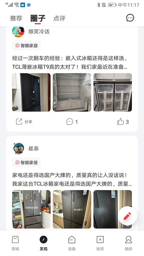 发现页设有推荐、圈子与点评板块,可查看其他用户的真实使用分享与评价。