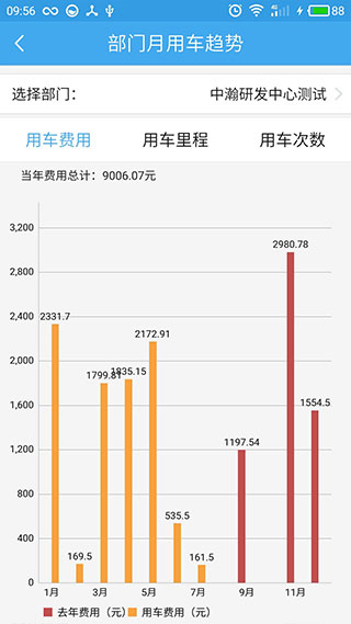 可在应用内查看部门月度用车趋势,包括车费、行驶里程等详细数据