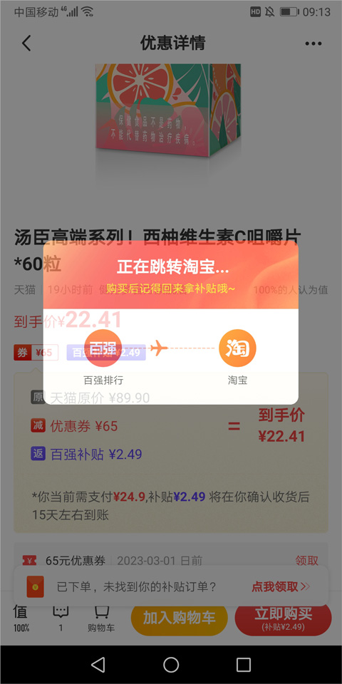 点击后将自动跳转至淘宝App完成后续下单与支付流程。