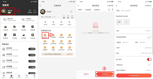 发布商品路径:进入【业务赋能】→点击顶部头像→选择【我的商品】;