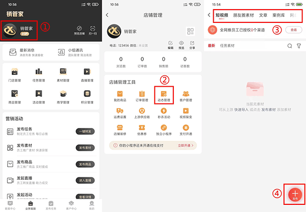 发布动态路径:进入【业务赋能】→点击顶部头像→进入【动态管理】→点击右下角【+发布】;