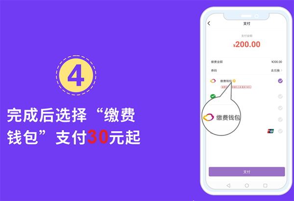 支付时选择“缴费钱包”,单笔金额需满30元。