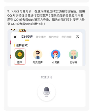以QQ分身为例,在悬浮窗中选定音色后,按住语音键即可实现实时变声(若目标应用需通过QQ或微信第三方登录,请先在变声器内完成对应账号的分身登录)。