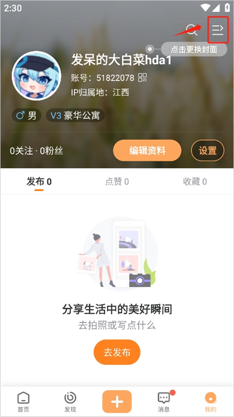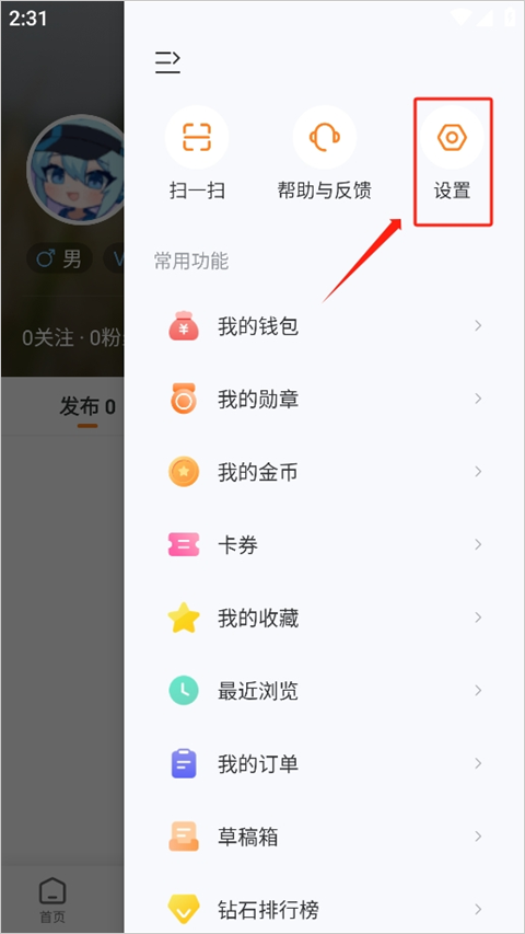 在“我的”页面右上角找到设置入口并点击。