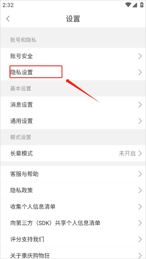 进入设置页面后,点击“隐私设置”进入相关配置。